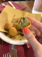 Prosíme číšníka, jestli by si nemohl zahrát na živý translater a uvést nás do obrazu alespoň ohledně předkrmů. Rádi bychom ochutnali něco lokálního. „Můžu, můžu,” všechno může, až by jeden čekal, že by klidně mohl mít i menu kompatibilní s dvacátým prvním stoletím, ale to zase ne. Mezi nabídkou zazní olivy plněné rybou. To mi přijde jako ideální volba k vínu, představuju si takové ty obří přímořské olivy a rybu, kterou Aquaman vylovil dnes ráno, takže máme jasno. Objednáváme plněné olivy „do placu“ a každý svou pizzu.