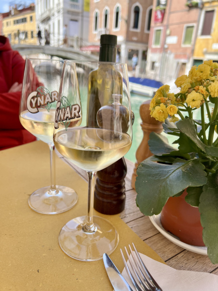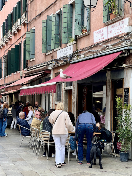 Nastupujeme na vodní metro, abychom mohli prozkoumat centrum Benátek za denního světla. Před dvěma dny město zpoplatnilo turistům vstup (to je náš společnej šestej smysl - co si můžeme zbytečně prodražit, si nechtěně zbytečně prodražíme), kupujeme tedy online dva pětieurové vstupy a jedeme. Hned po vystoupení nám dochází, že další nedomyšlenost byla naplánovat si Benátky zrovna na víkend. Množství turistů je enormní a chvilkama si nejsme jistí, jestli jsme se náhodou nevylodili v Japonsku. I přes to má ale město žijící na vodě pořád velké kouzlo a nezpochybnitelnou výhodou je, že se dají všechny dominanty obejít za jeden den, a to i dvakrát nebo třikrát. Když míjíme Most vzdechů potolikáté, že už mám tendenci taky znuděně vzdychnout, zhodnotíme, že je nejvyšší čas uklidit se někam na polední dvojku červeného a něco drobného za škraň. Najdeme menší restauraci, objednáváme džbánek vína a z předkrmů vybíráme koule z kozího sýra. Opět si představuju lahodný sýr specifické jižanské chuti, opět nám na stole přistává smažená koule, ježišikriste, jsem nepoučitelná! Žvýkám tu gumovou hmotu a vzpomínám na jednu olomouckou hospodu, kde mají na jídelním lístku napsáno „usmažíme cokoliv“. Tady by si z toho mohli udělat městský slogan.
